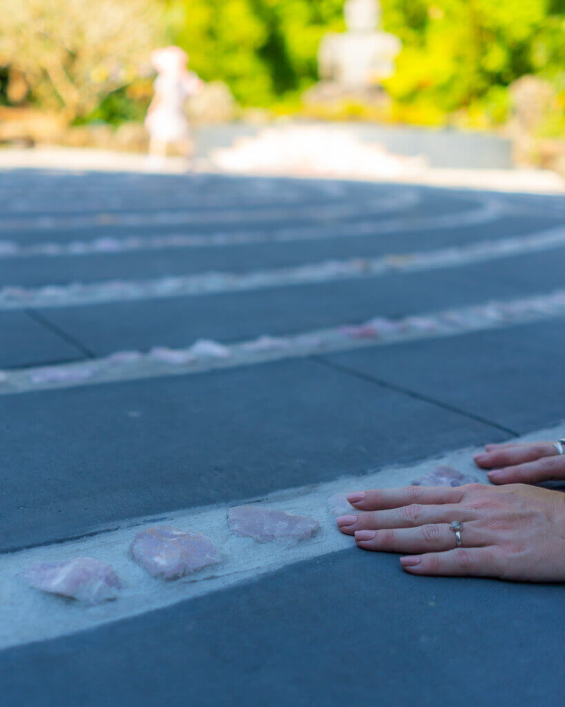 Our Crystal Labyrinth now has over 10,000 rose quartz crystals set into mortar between all of its pathways. Underneath these pieces of rose quartz are thousands of intention cards where visitors have written their messages of love, hope and peace.